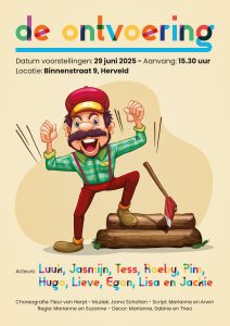 Vis aan je voetTijdens een schoolreisje naar zee ontmoeten de kinderen Neptunus en beleven ze allerlei avonturen. Als ze wakker worden hebben ze een verrassing aan hun voet. Deze muzikale theatervoorstelling werd gespeeld door Aafke Hendriksen, Renske van de Linden, Jaël van Harn, Isabel van Deursen, Lara Scholten, Daan van Koolwijk en Suzanne Kiers. De voorstelling werd gespeeld op 8 en 9 april 2017 in De Hoendrik in Herveld. |